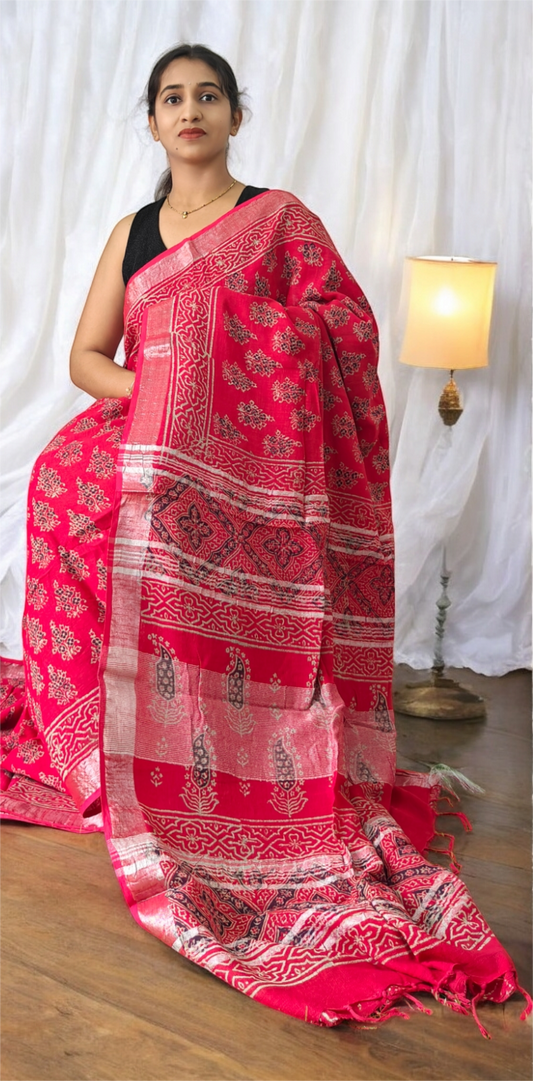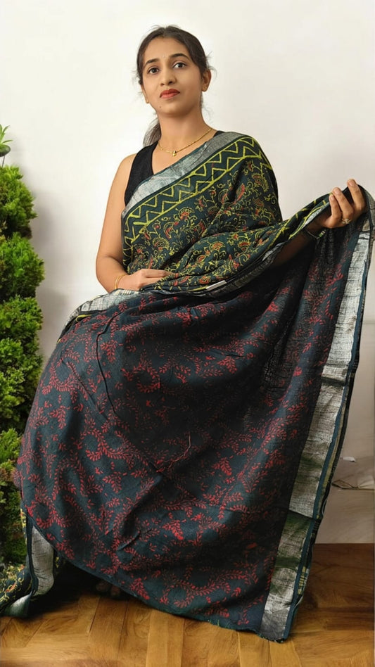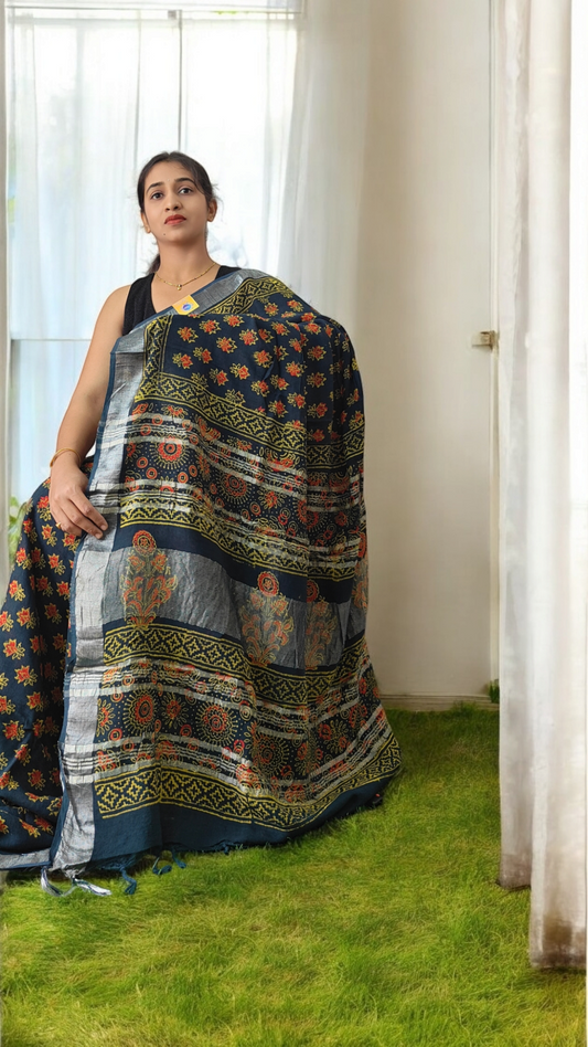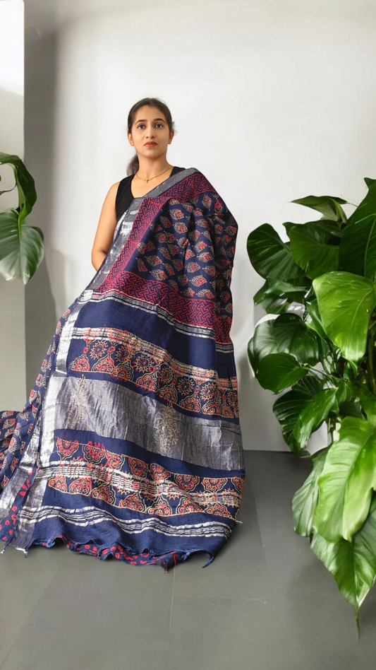 Ajrakh block print Linen cotton sarees