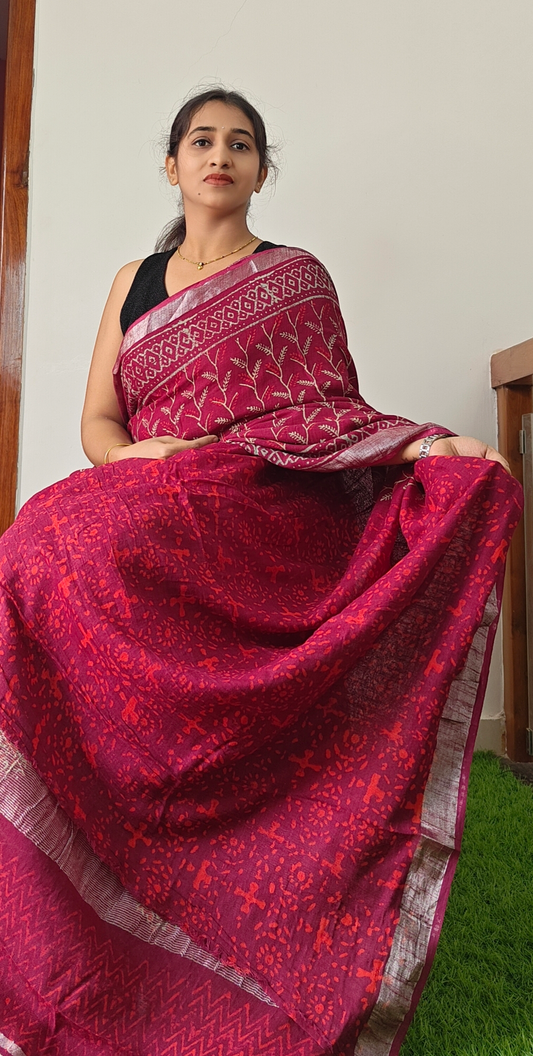 Aarna Red Block printed Linen Saree