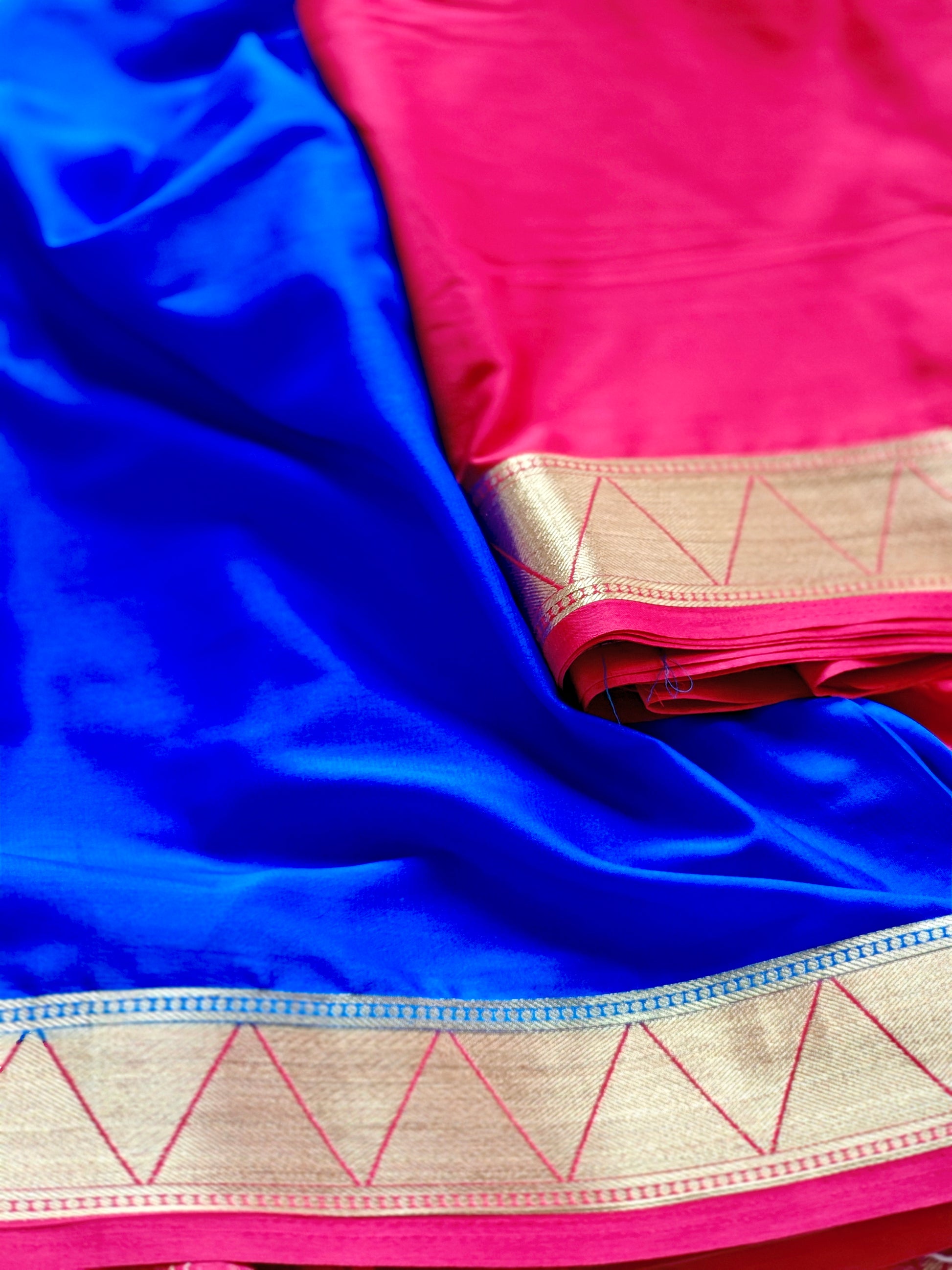 This Bright Red & Royal Blue semi crepe silk saree features a beautiful half-and-half pattern crafted from premium quality fabric. Its sophisticated design is elevated by intricate zigzag golden borders that enhance the saree’s richness and elegance. Ideal for special occasions, this saree combines vibrant hues and fine craftsmanship to offer a timeless, graceful appearance.