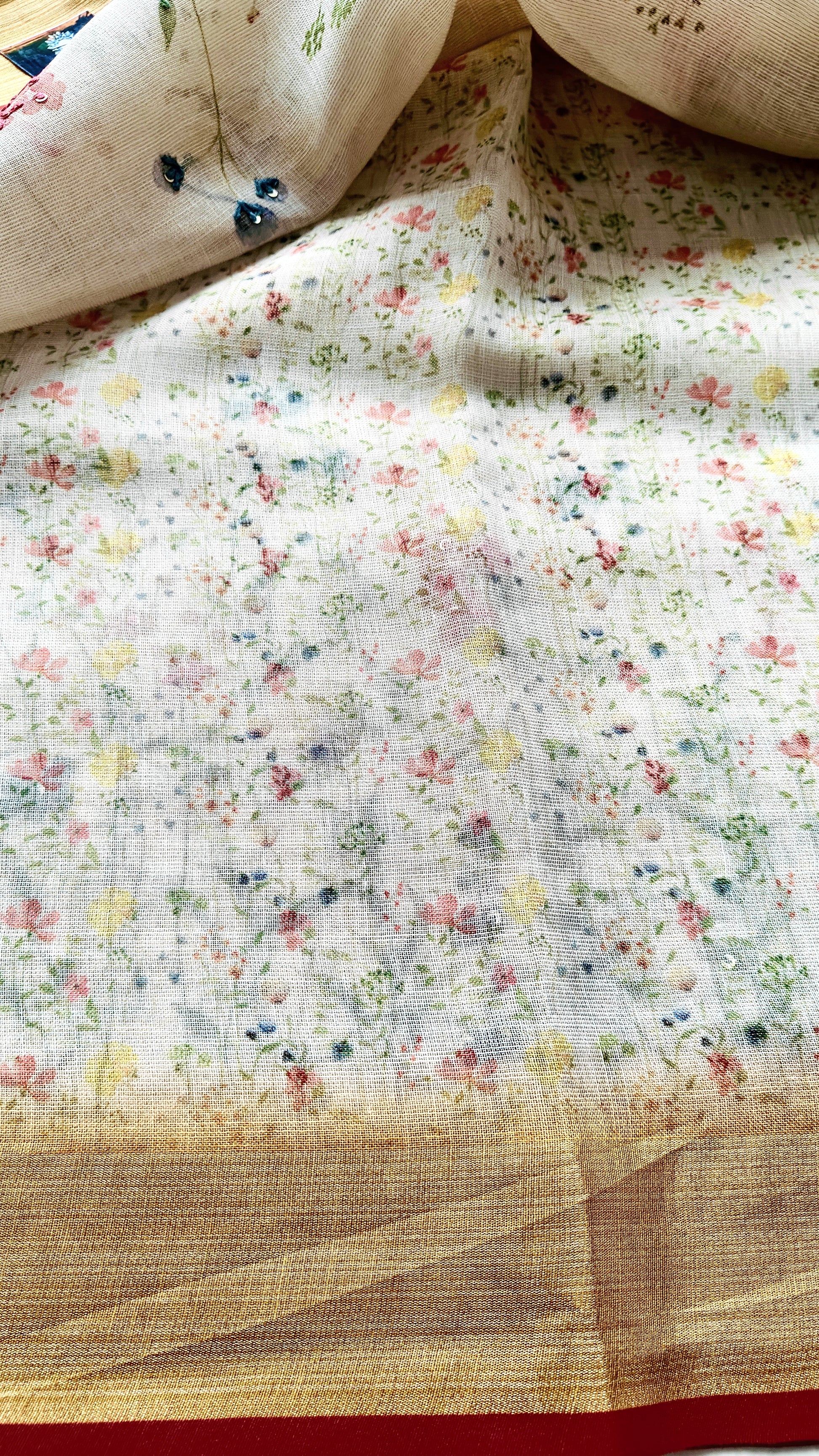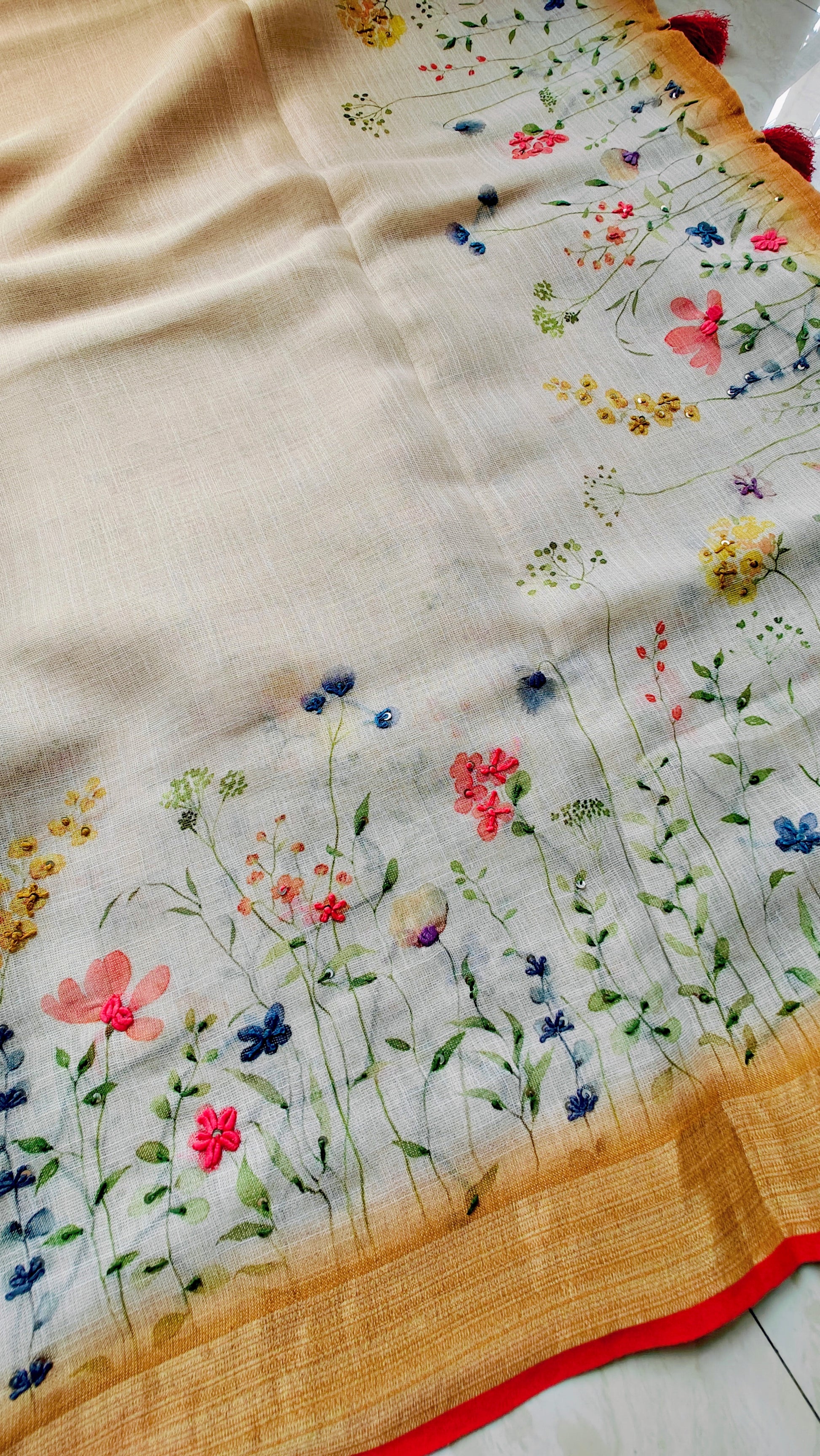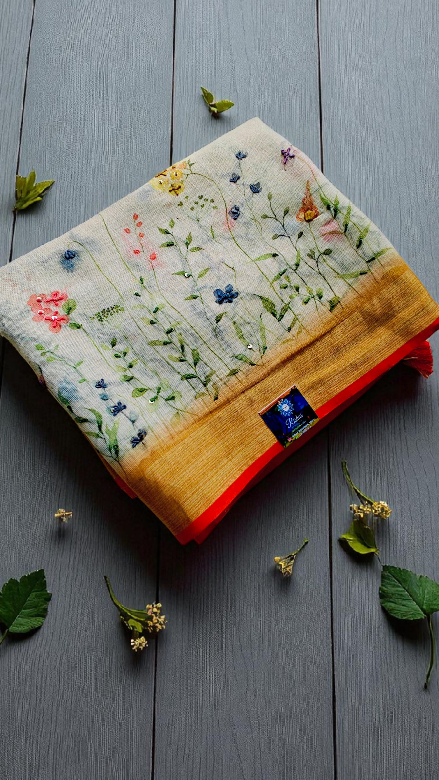 Experience elegance with this golden white pure hand-painted linen saree with hand embroidery. Crafted from premium linen, its breathable fabric ensures comfort throughout the day. The meticulous hand-painted design adds an artistic touch, making it perfect for formal occasions or festive celebrations. This saree combines traditional craftsmanship with contemporary style, offering a timeless addition to your wardrobe.