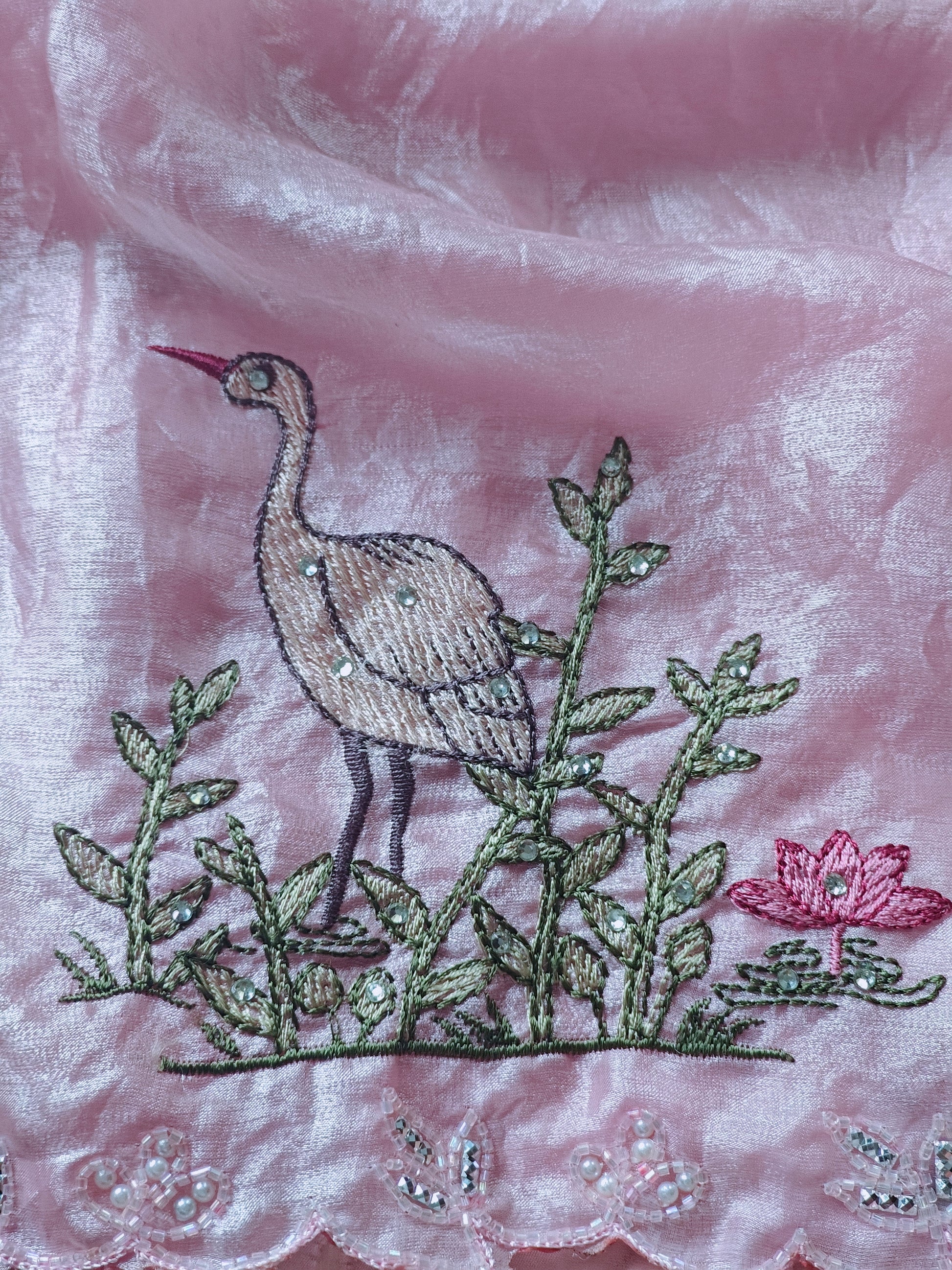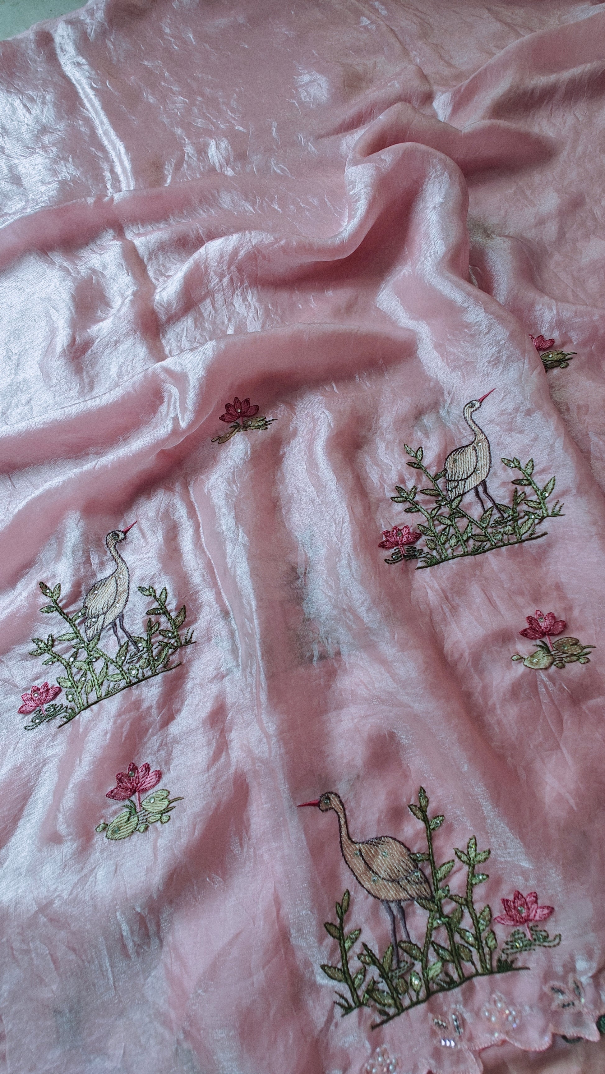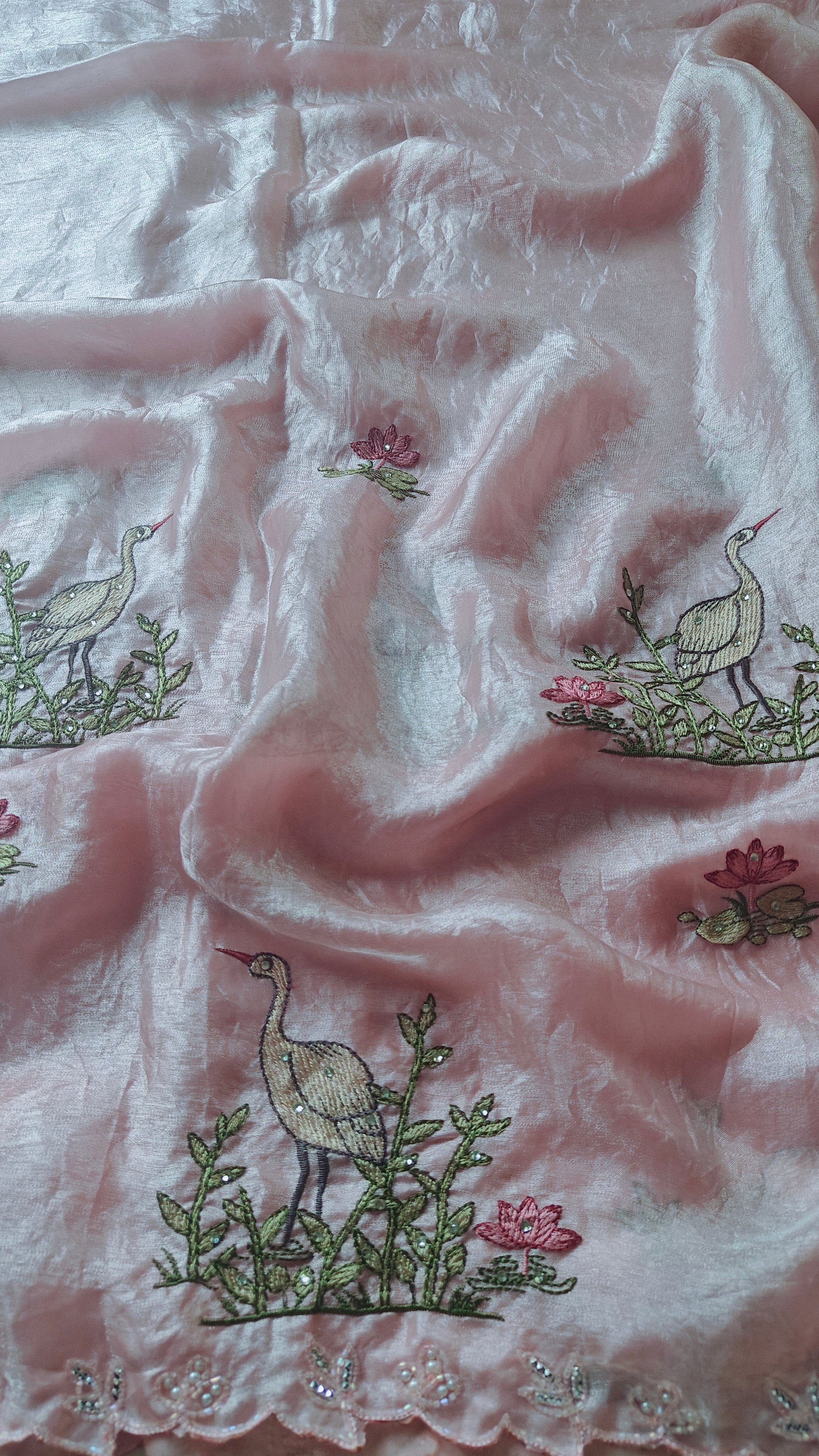 This light pink pure soft glass tissue saree showcases delicate embroidery motifs that enhance its elegance. Accented with intricately designed cutdana work borders, it offers a refined texture and subtle shimmer, perfect for sophisticated occasions. Crafted for comfort and style, this saree combines traditional craftsmanship with a lightweight, breathable fabric ideal for graceful draping.