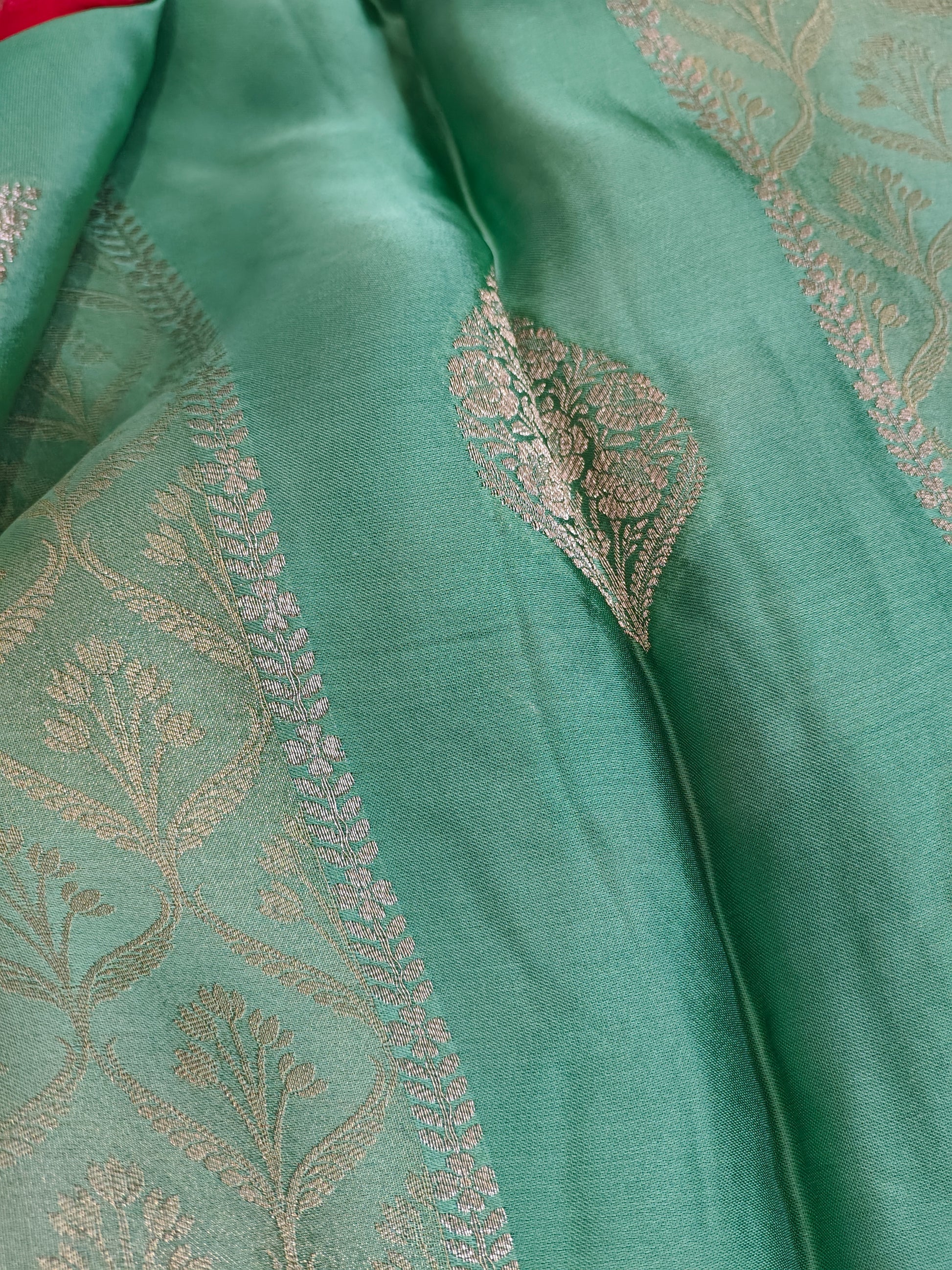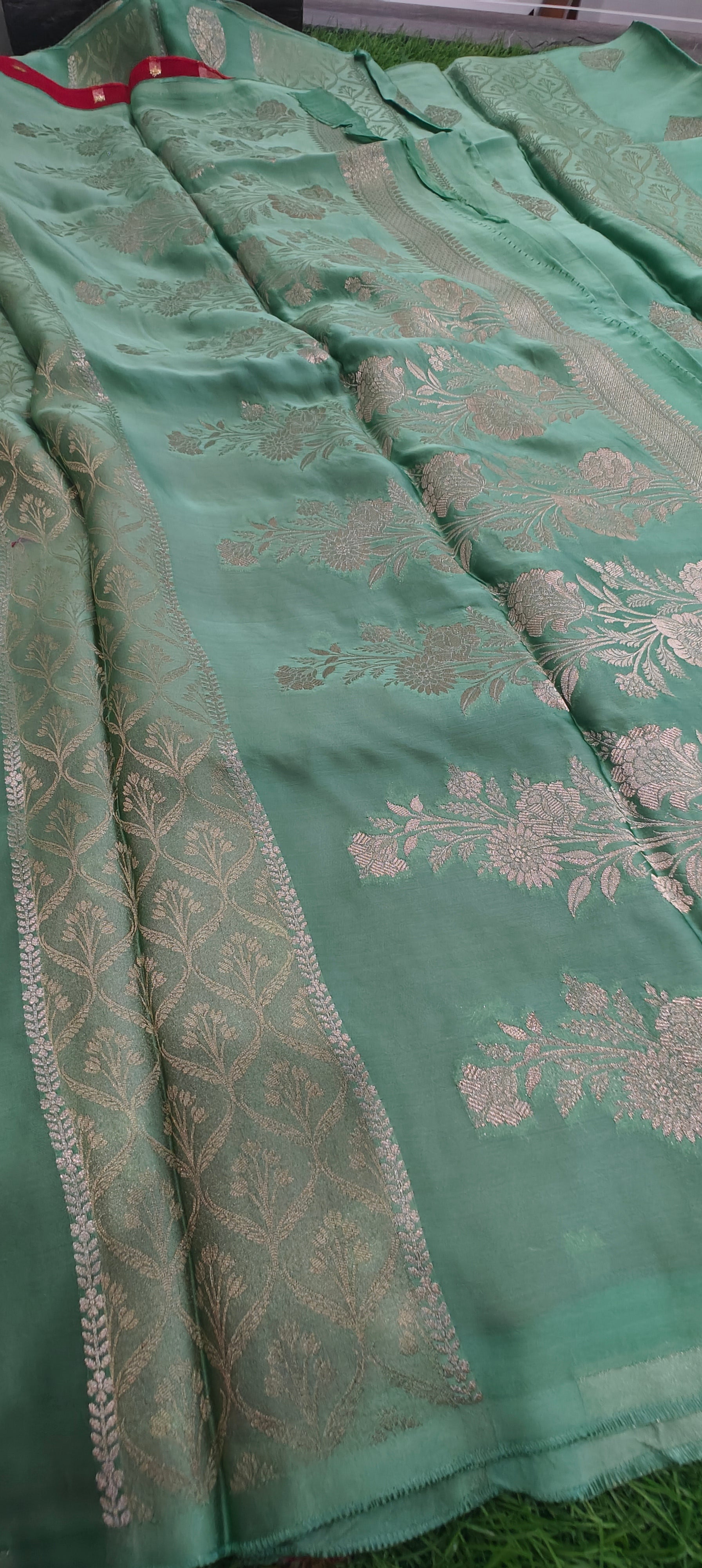 Elevate your wardrobe with this designer sea green Pure Satin crepe silk saree, featuring a luxurious, borderless design that exudes elegance. The saree’s rich sea green hue is complemented by a contrasting blouse, while its sheer shine adds a subtle, sophisticated glow. Crafted from premium Satin crepe silk, this saree offers a graceful drape and a refined texture, perfect for special occasions where understated luxury is desired.