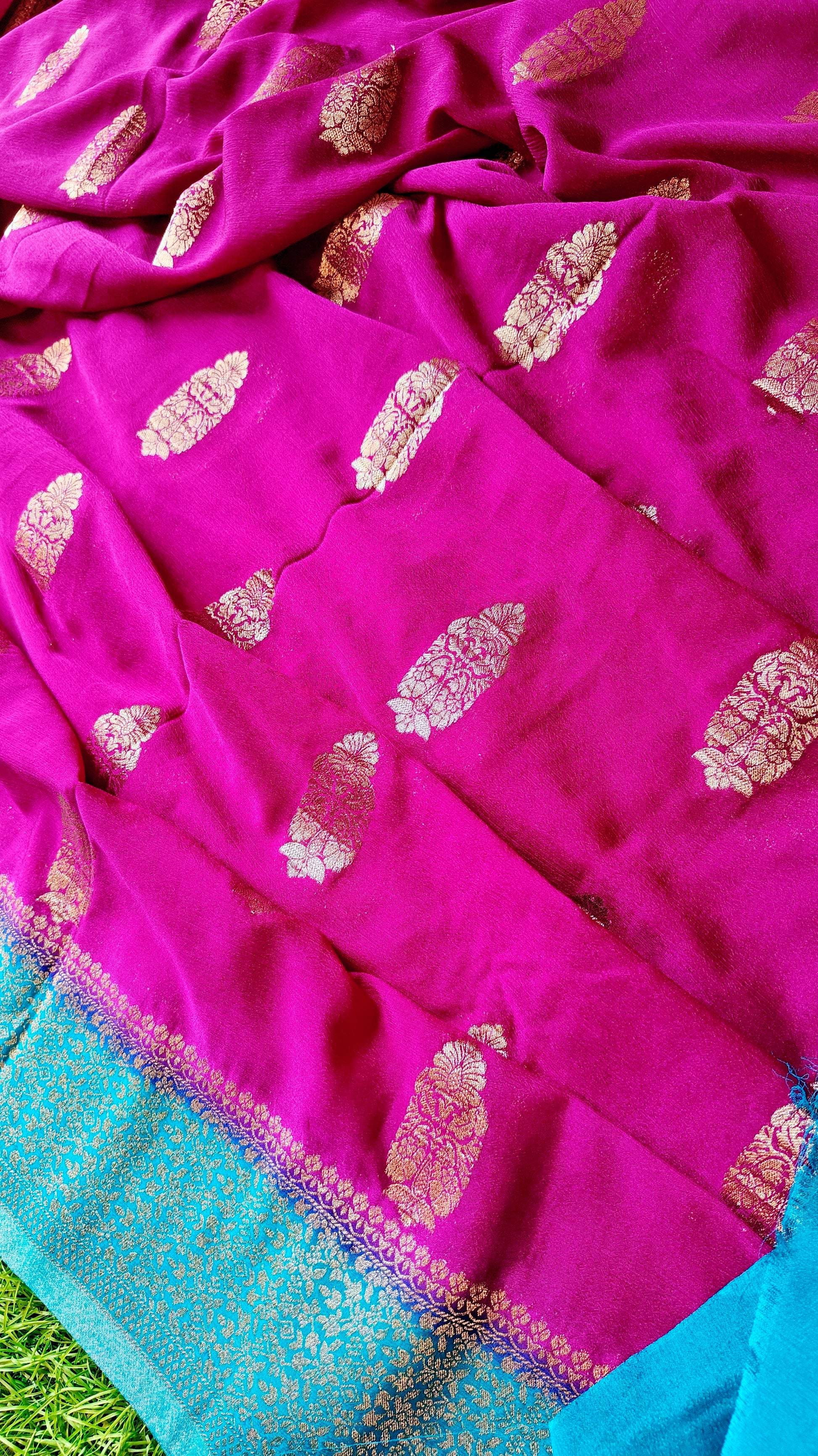 This elegant dark violet & rama green Pure Chinnon Silk saree showcases a rich contrast pallu that enhances its traditional appeal. Featuring a beautifully detailed motif woven throughout, it pairs perfectly with a contrast butta blouse to complete a refined, sophisticated look. Ideal for festive occasions and formal gatherings, this saree combines luxurious silk texture with timeless design, ensuring you stand out with grace and style.