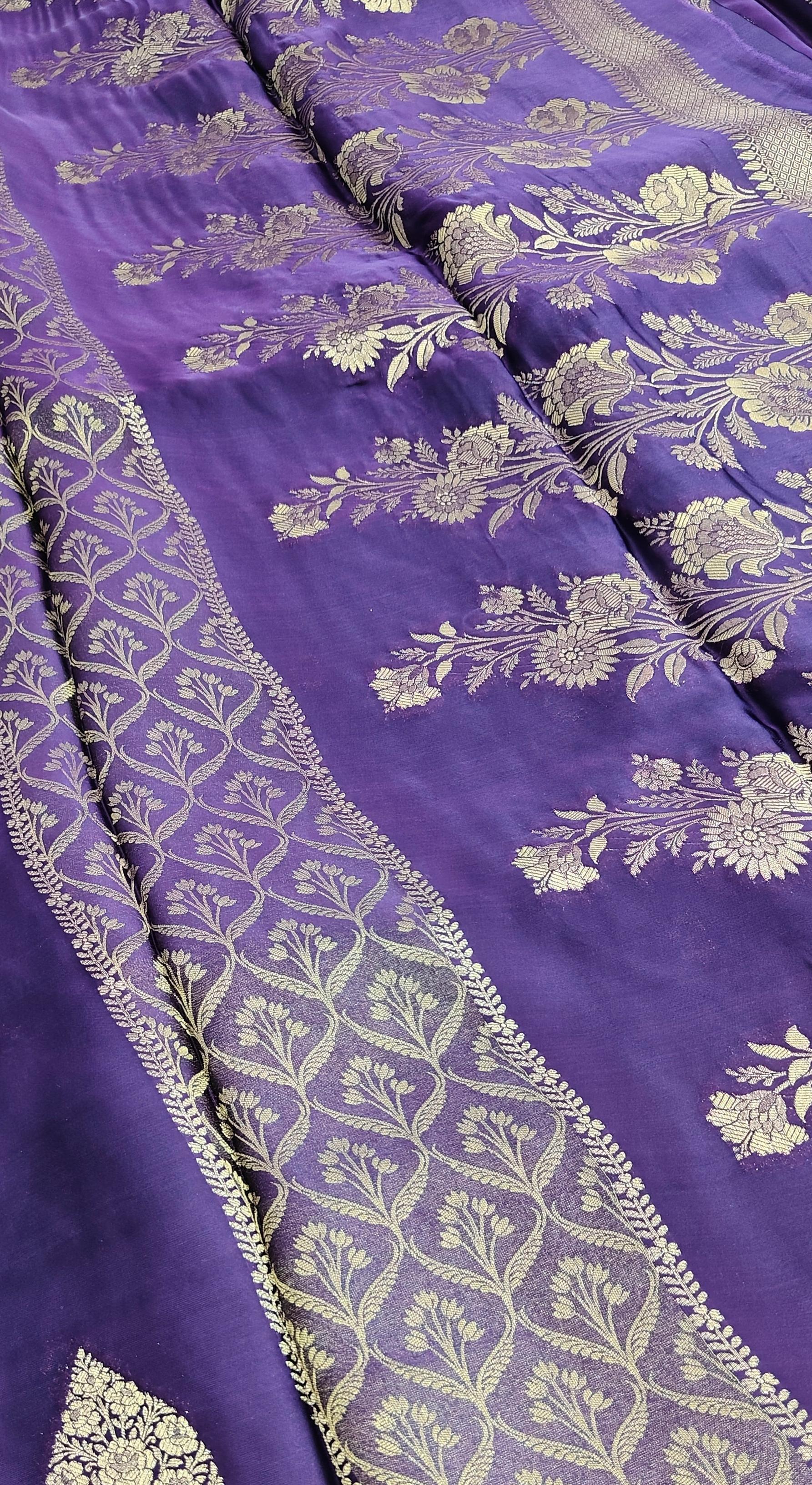 Elevate your wardrobe with this designer Purple Pure satin crepe silk saree, featuring a luxurious, borderless design that exudes elegance. The saree’s rich purple hue is complemented by a contrasting blouse, while its sheer shine adds a subtle, sophisticated glow. Crafted from premium satin crepe silk, this saree offers a graceful drape and a refined texture, perfect for special occasions where understated luxury is desired.