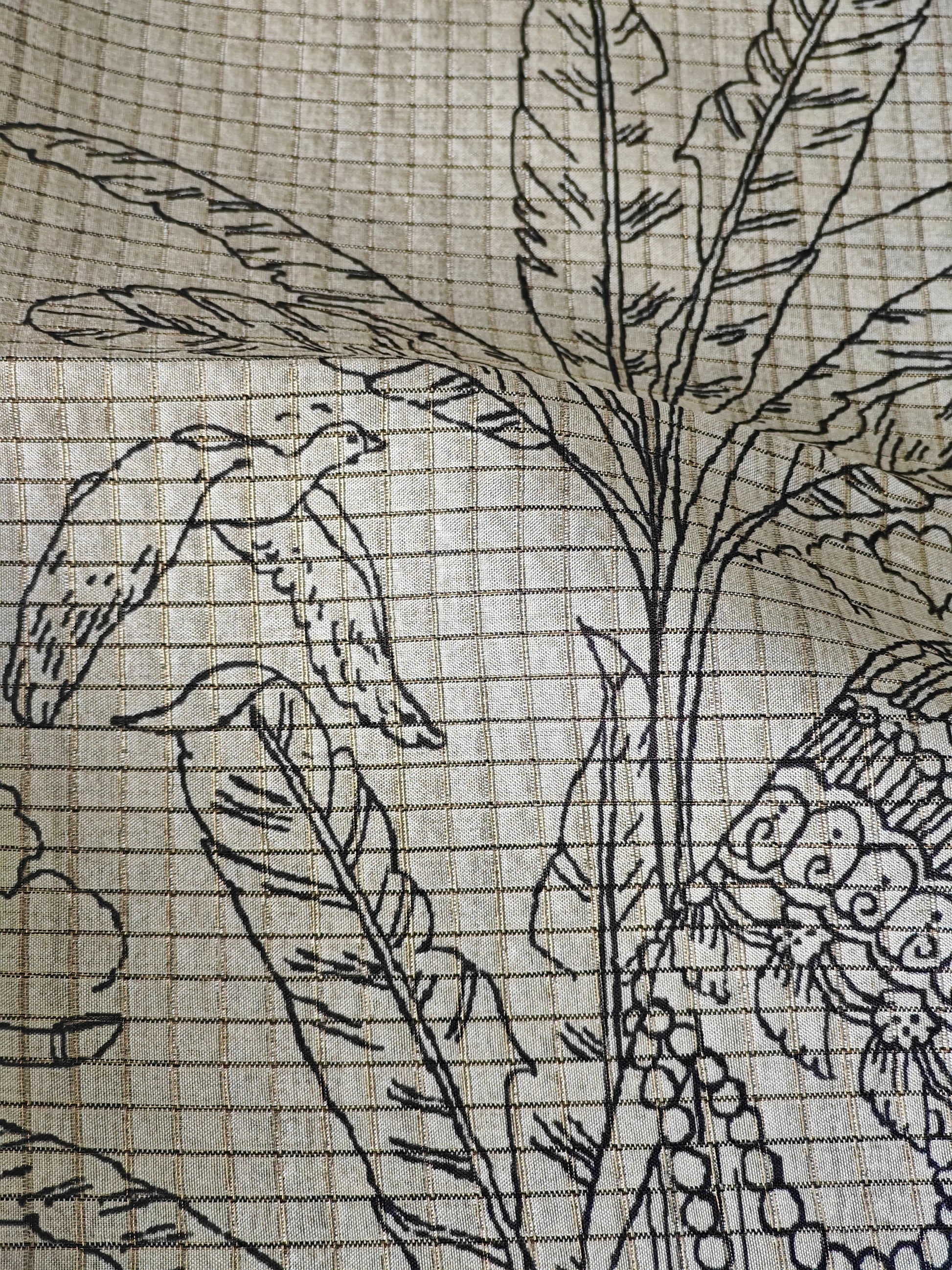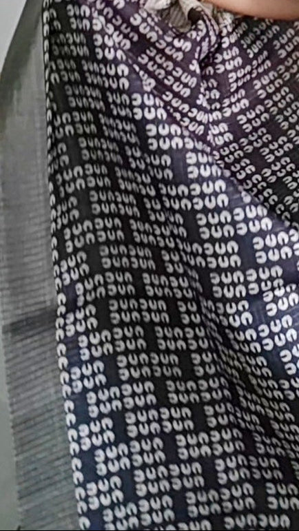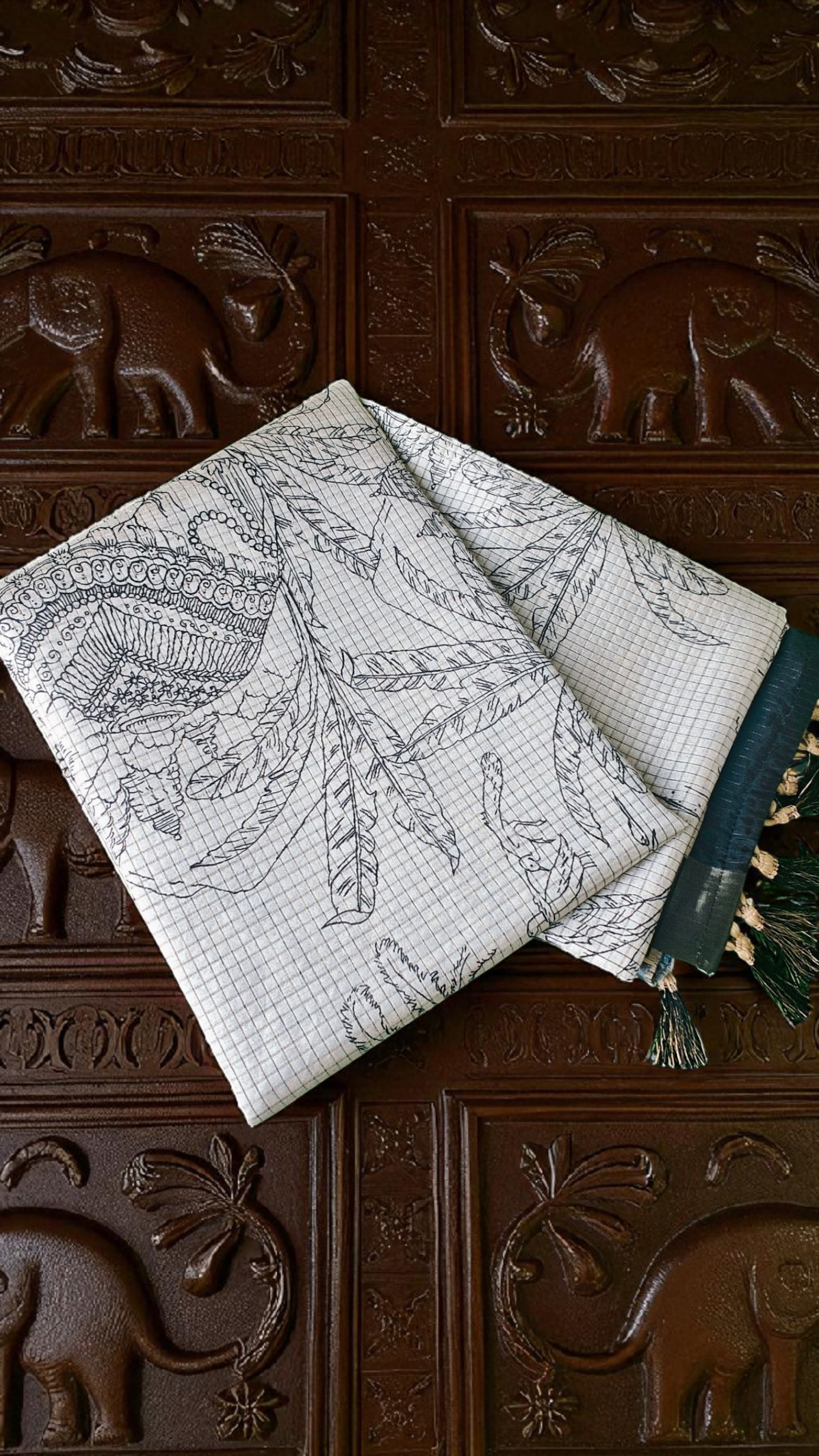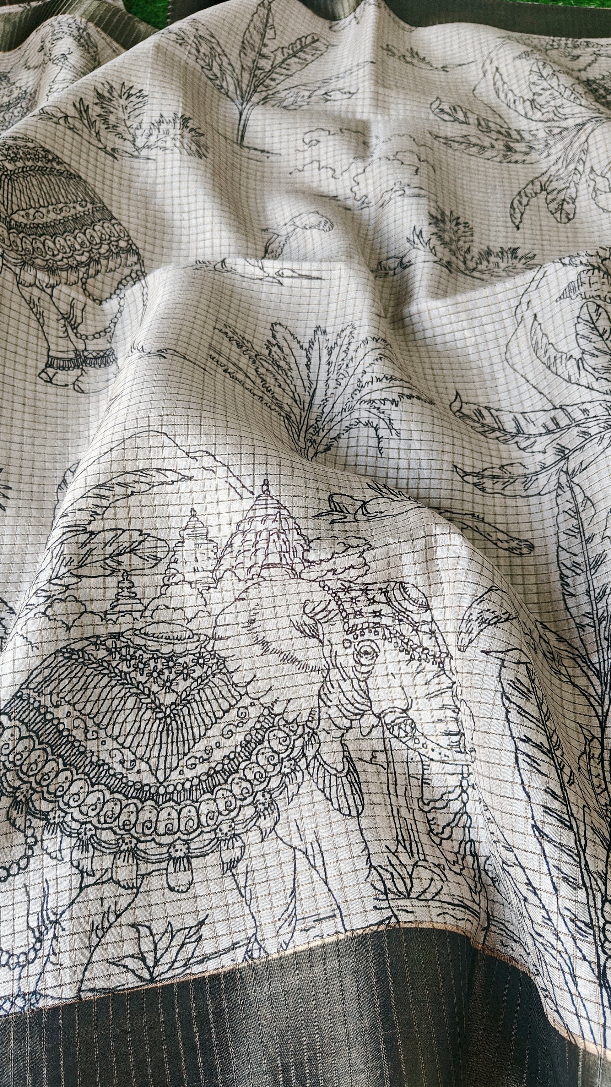 This black and white semi tussar saree features a sophisticated digital pen Kalamkari design, enhanced by a subtle sheen that adds elegance to its texture. The saree is adorned with delicate golden micro chex throughout, offering a refined and timeless appeal—perfect for those who appreciate traditional craftsmanship with a contemporary touch.